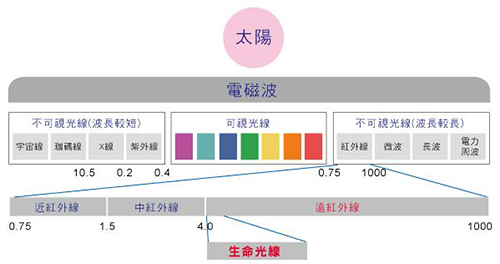 太陽光大致分為可見光及不可見光。其中可見光中紅光外側(cè)的光線,在光譜波長自0.75-1000微米的一段被稱為紅外線。遠紅外線是一種對人體有益的光,被稱為“生命之光”。