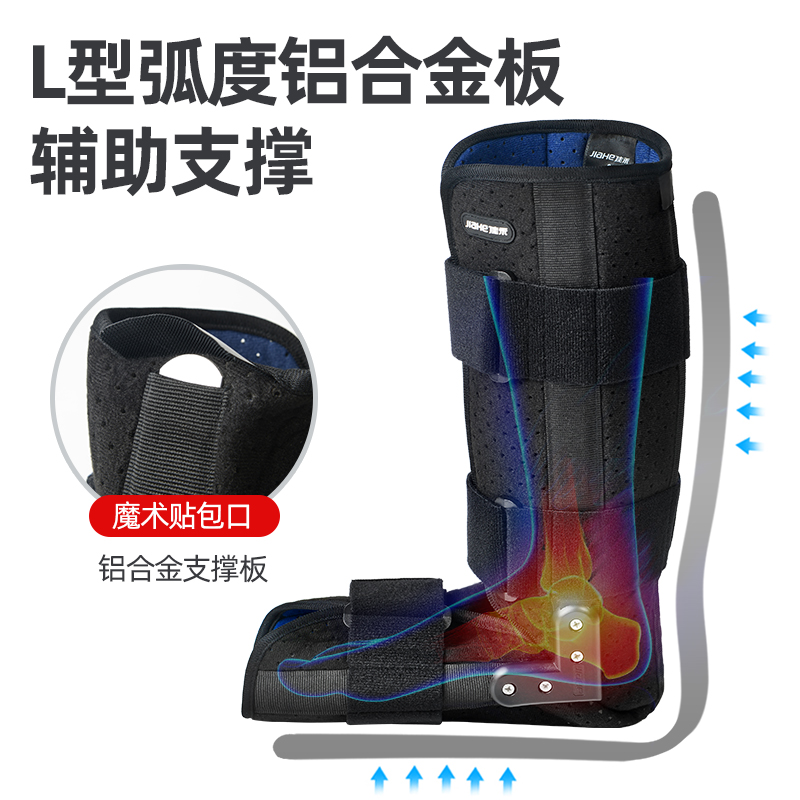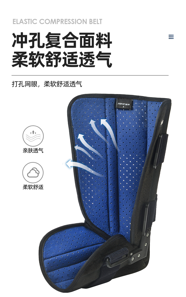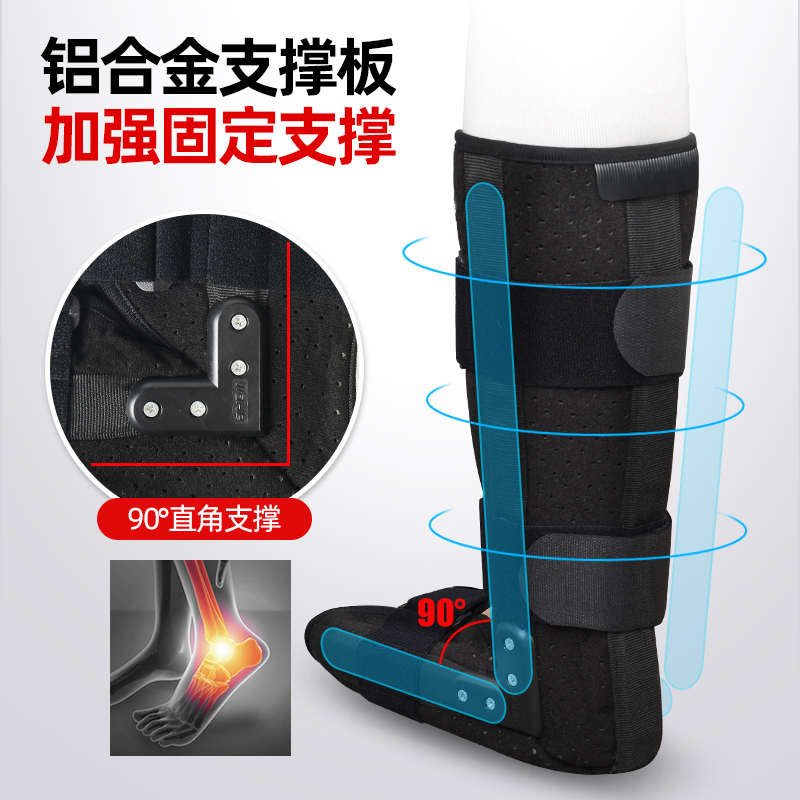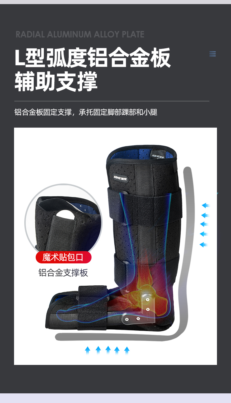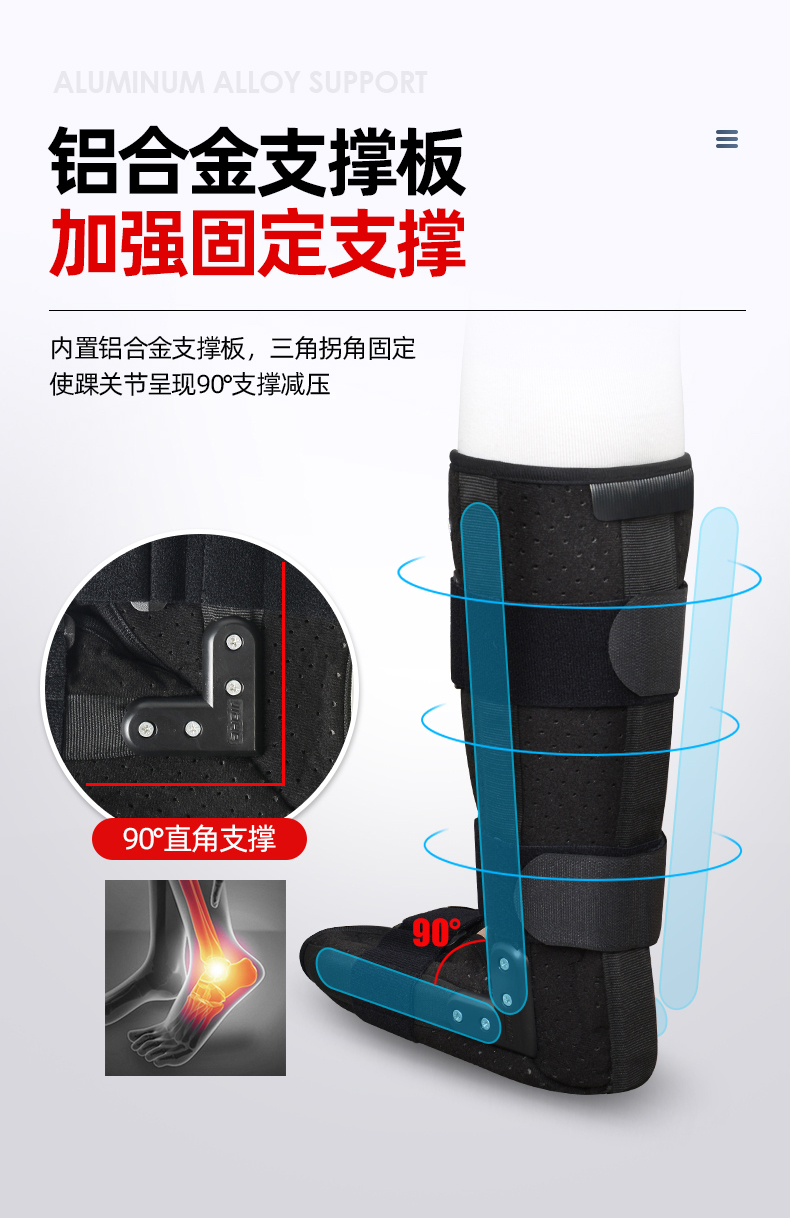 2、內(nèi)置鋁合金支撐板,三角拐角固定,使踝關(guān)節(jié)呈現(xiàn)90度支撐減壓