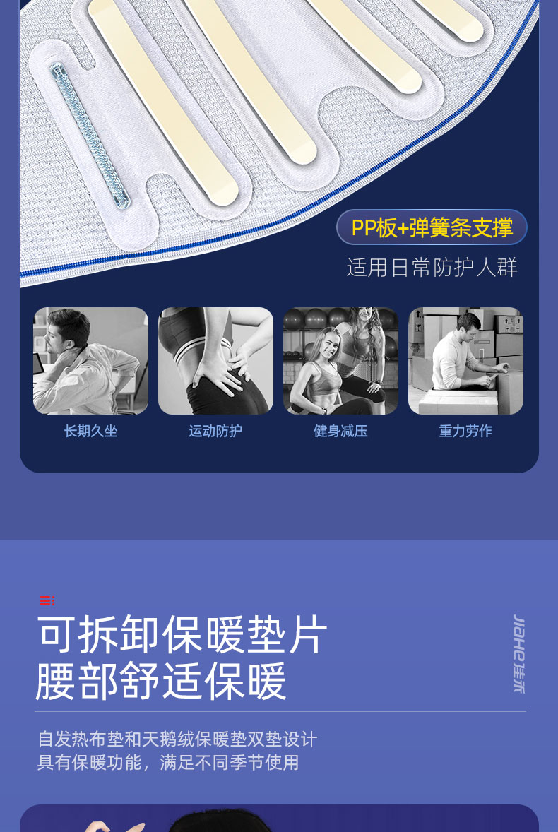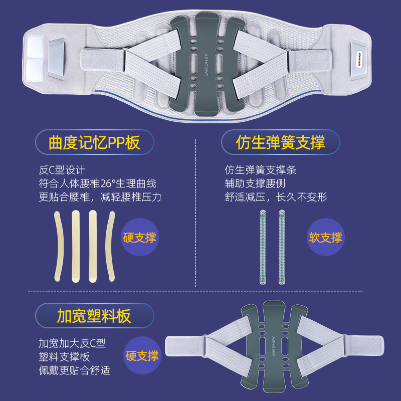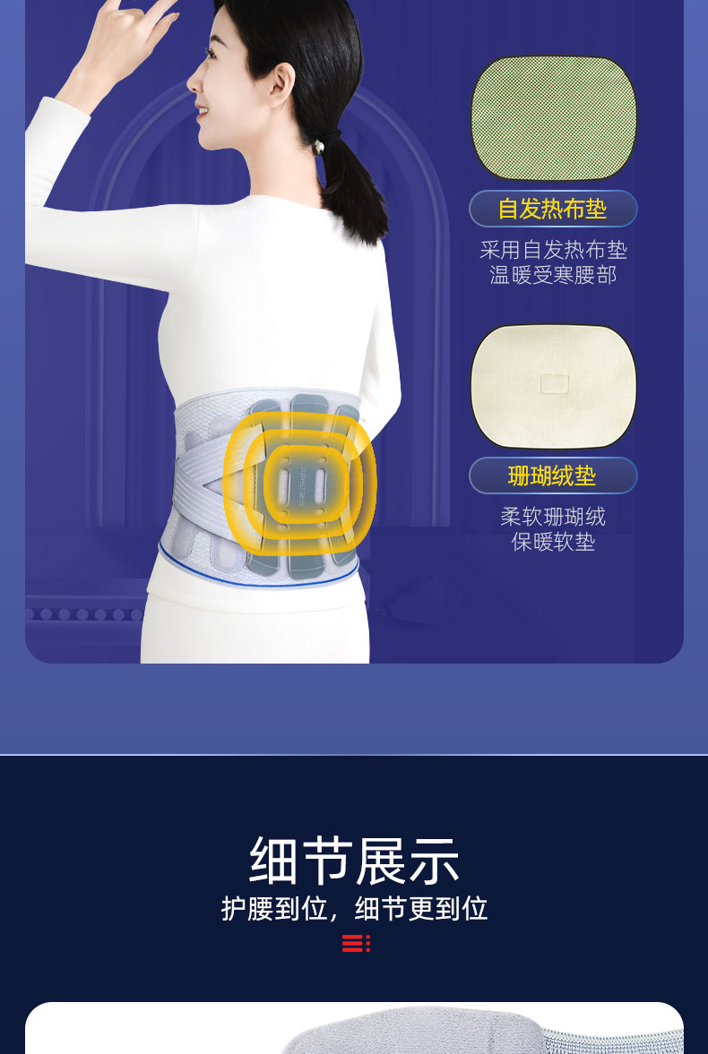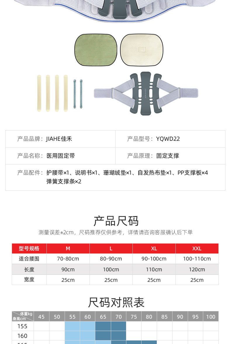 配件:護(hù)腰帶×1、說明書×1、珊瑚絨墊×1、自發(fā)熱布墊×1、PP支撐板×4、彈簧支撐條×2