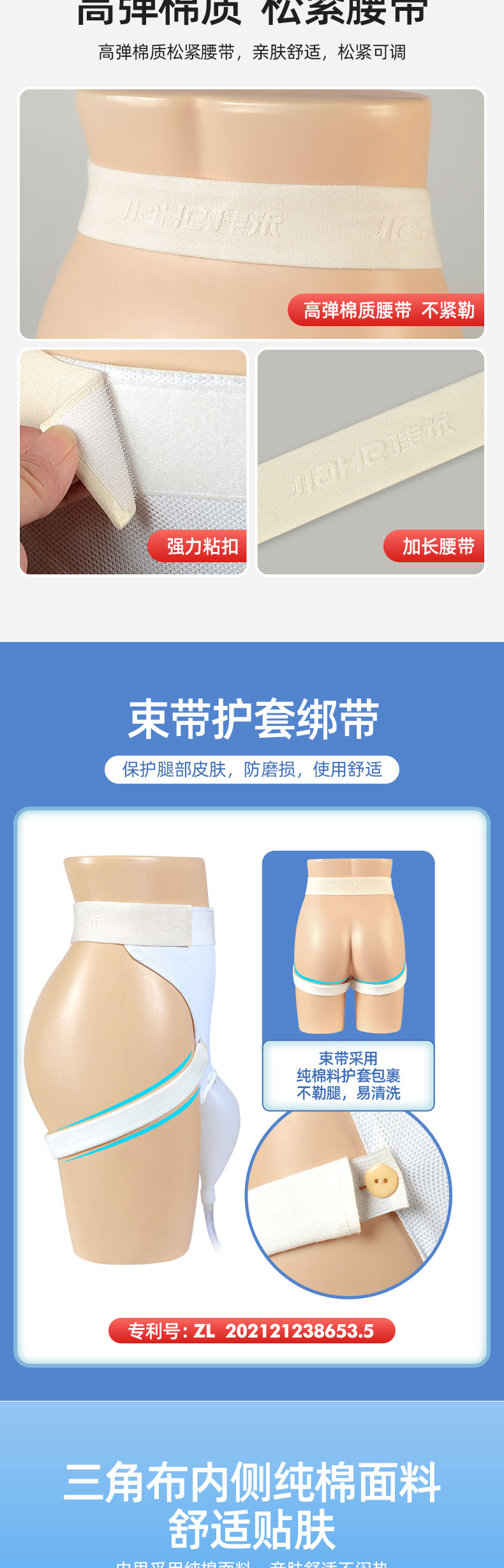 束腿帶采用多孔彈力帶,配純棉護(hù)套,不勒腿,易清洗,親膚舒適,松緊可調(diào);