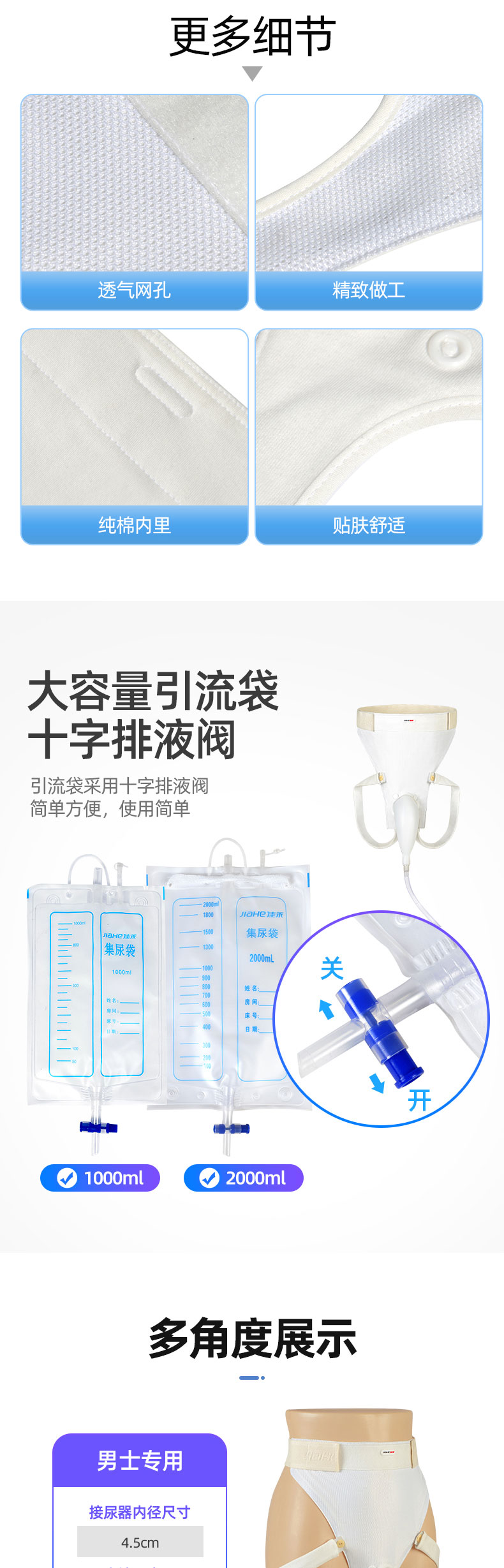 集尿袋選用加厚柔軟材質(zhì),自帶懸掛管和掛繩,排液閥可以單手操控;